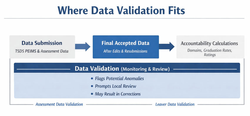 Data Validation flags potential anomalies in the same data that later feed accountability calculations. While it does not calculate ratings, it provides a structured process for reviewing and, when appropriate, correcting data that affect accountability measures.