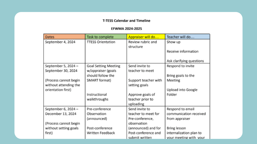 Backward design everything: district timelines, campus expectations, teacher deadlines, and student evidence. If you rush T-TESS, people will assume you don’t care about it.